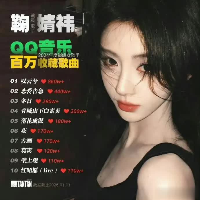 粉丝们频繁提到鞠婧祎在2018年发行的单曲《叹云兮》,在QQ音乐、酷狗等三大平台的累计收藏量突破了2700万,其中酷狗单平台就达到了1400万,成为了具有显著长尾效应的代表作。